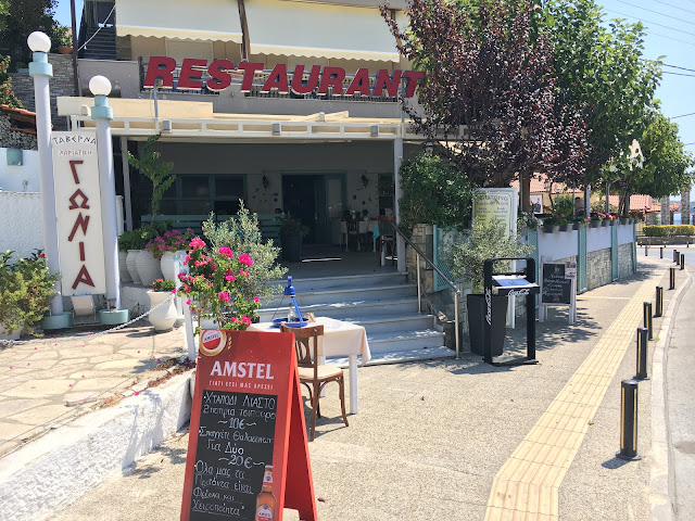 Desigur, pe la 12 a inceput sa se aglomereze, asa ca am ridicat ancora si am plecat spre un sat pitoresc din mijlocul peninsulei, Parthenonas. Abandonat de locuitori prin anii 1970 (care au migrat spre orasul din apropiere, Neos Marmaras, ca sa ridice un mare complex turistic, Porto Karras), a fost reinviat de investitori / entuziasti prin anii 1990, si ar trebui sa arate ca un satuc traditional minunat. Nu voi sti deocamdata, intrucat nu am mai ajuns acolo. Nici atunci, nici in alta zi din excursie cand putea fi o optiune :). Treaba e ca am ajuns pe la un indicator spre Neos Marmaras, ne era foarte foame, si am zis ca aveam mai mari sanse sa gasim acolo ceva de mancare decat intr-un satuc abandonat si cu cateva restaurante care adunasera recenzii amestecate. Am parcat pe primul loc gasit, ceea ce a fost bine, caci am intrat in restaurantul in fata caruia parcasem, zicand ca a fost mana Domnului: Choriatiki Gonia. Pentru noi a fost o experienta foarte placuta: mancare buna, servire prompta, priveliste super peste portul din oras. Recenziile erau si ele foarte bune. Acum, cand scriu, si caut niste recenzii mai vechi, vad ca in urma cu doi ani turistii aveau nemultumiri: servire, portii, gustul preparatelor, preturi. Cred ca pandemia a omorat turismul in Grecia. Peste tot pe unde am fost se vedea si se simtea asta. Cred ca locurile erau supra-aglomerate in urma cu un an. Acum batea vantul...